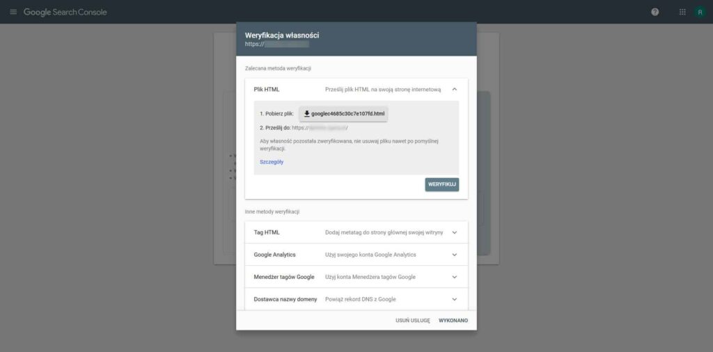 Po dodaniu strony musisz zweryfikować jej własność. Masz do wyboru 5 metod weryfikacji: