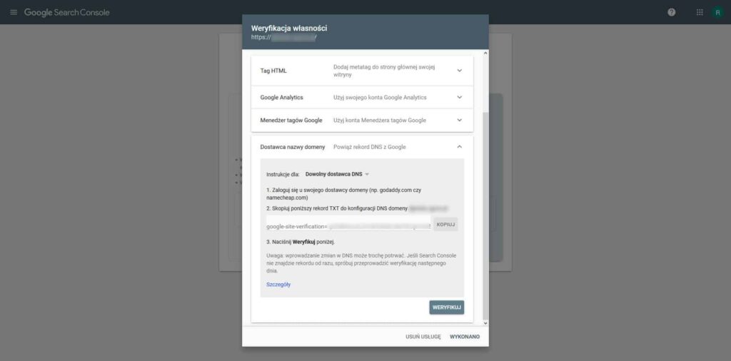 Weryfikacja własności strony w Google Search Console poprzez wpis DNS