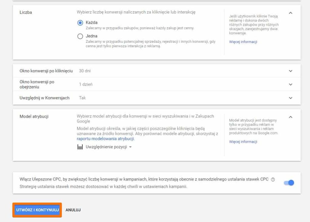 Wybierz w jaki sposób konwersja mają być zliczane (wielokrotnie czy pojedynczo). Wpisz ilość dni po jakich konwersja po kliknięciu zostanie przypisana do kampanii w przypadku kliknięć oraz wyświetleń (dla kampanii display i YouTube).