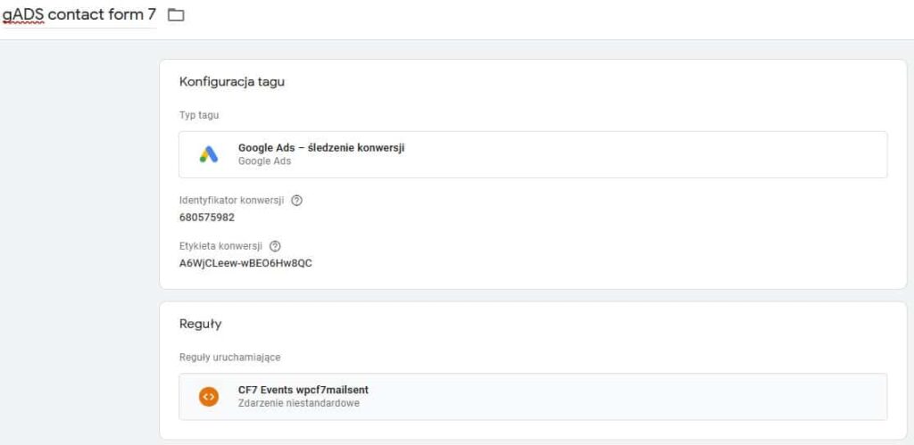 Przejdź teraz do Google Tag Manager, utwórz nowy Tag – Google Ads – śledzenie konwersji. Wprowadź dane z panelu konfiguracji konwersji w Google Ads. Jako regułę wybierz CF7 Events wpcf7mailsent. Zapisz ustawienia.